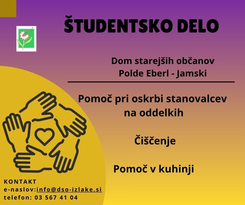 Ekipa Doma starejših občanov Polde Eberl Jamski na Izlakah v svoje vrste vabi študente za opravljanje študentske dela v času letnih dopustov.